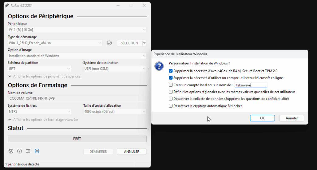 Ici, exception : on utilise un outil externe. Connu pour fabriquer des clés USB d’installation, Rufus embarque aussi des paramètres ciblant Windows 11. En patchant l’ISO lors de la création du support, il contourne les exigences matérielles et laisse l’installateur poursuivre sans blocage.