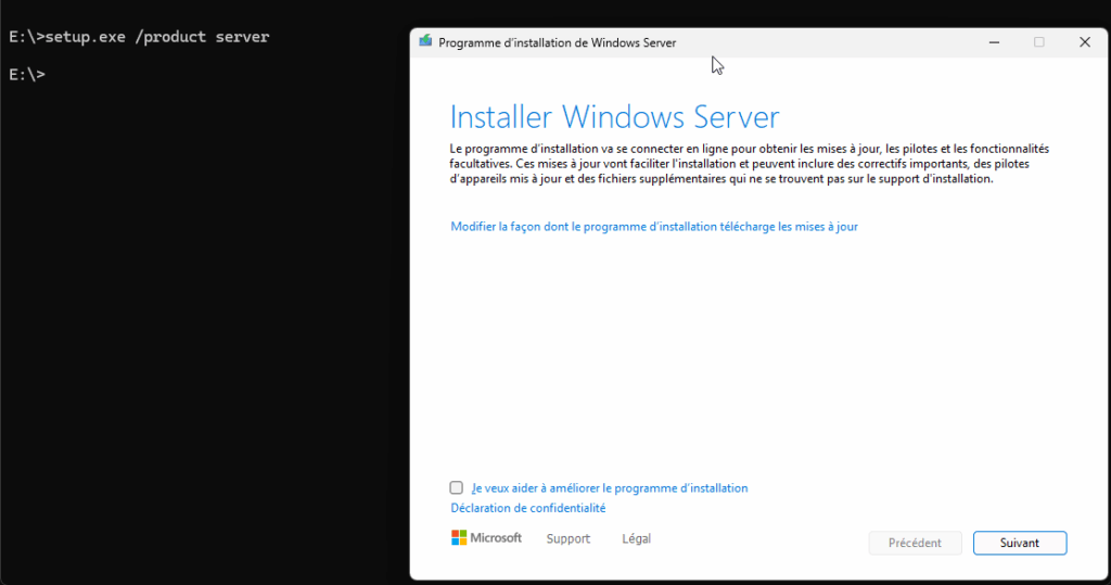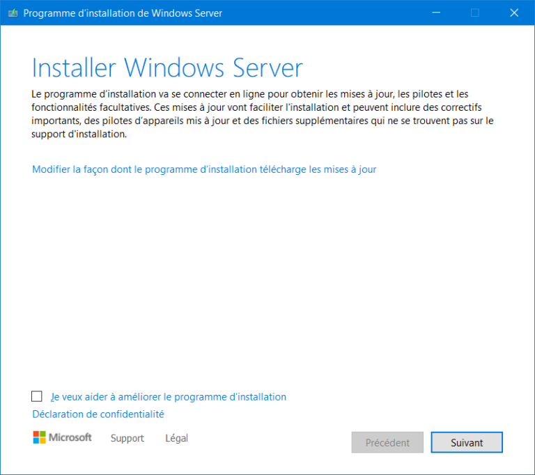 Le programme d’installation de Windows 11 se lance. Vous noterez que la fenêtre affiche « Installer Windows Server » mais pas d’inquiètude c’est bien l’édition correspondante à celle que vous avez déjà (Famille, Professionnel ou Éducation) qui sera installée sur votre ordinateur.
